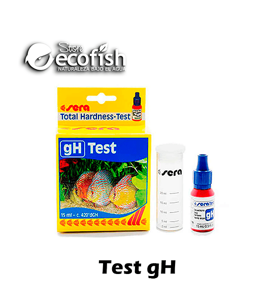 Test de gH para acuarios en gotas; sirve para agua dulce solamente; envase de 15 ml, rinde cerca de 420 °dgH medidos.